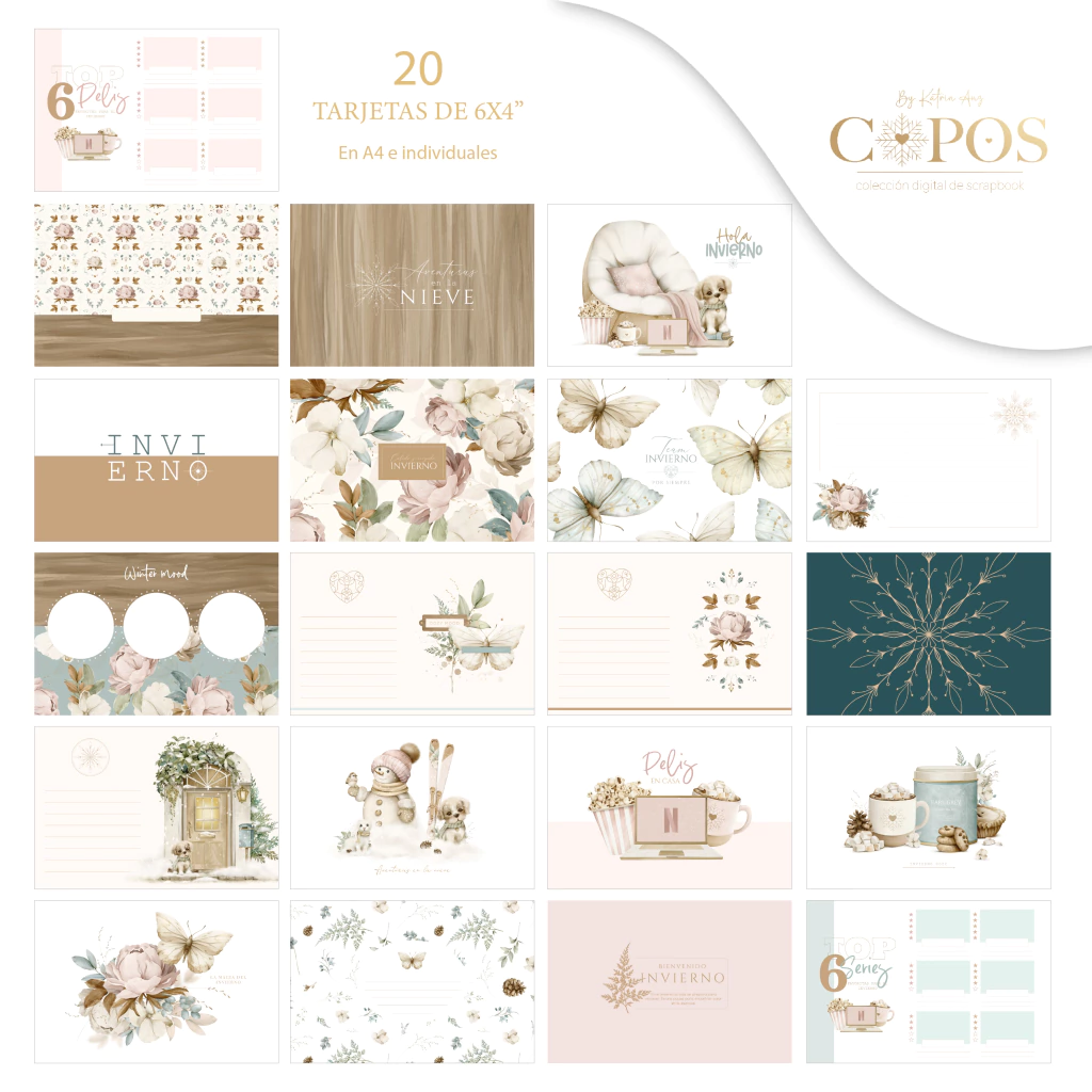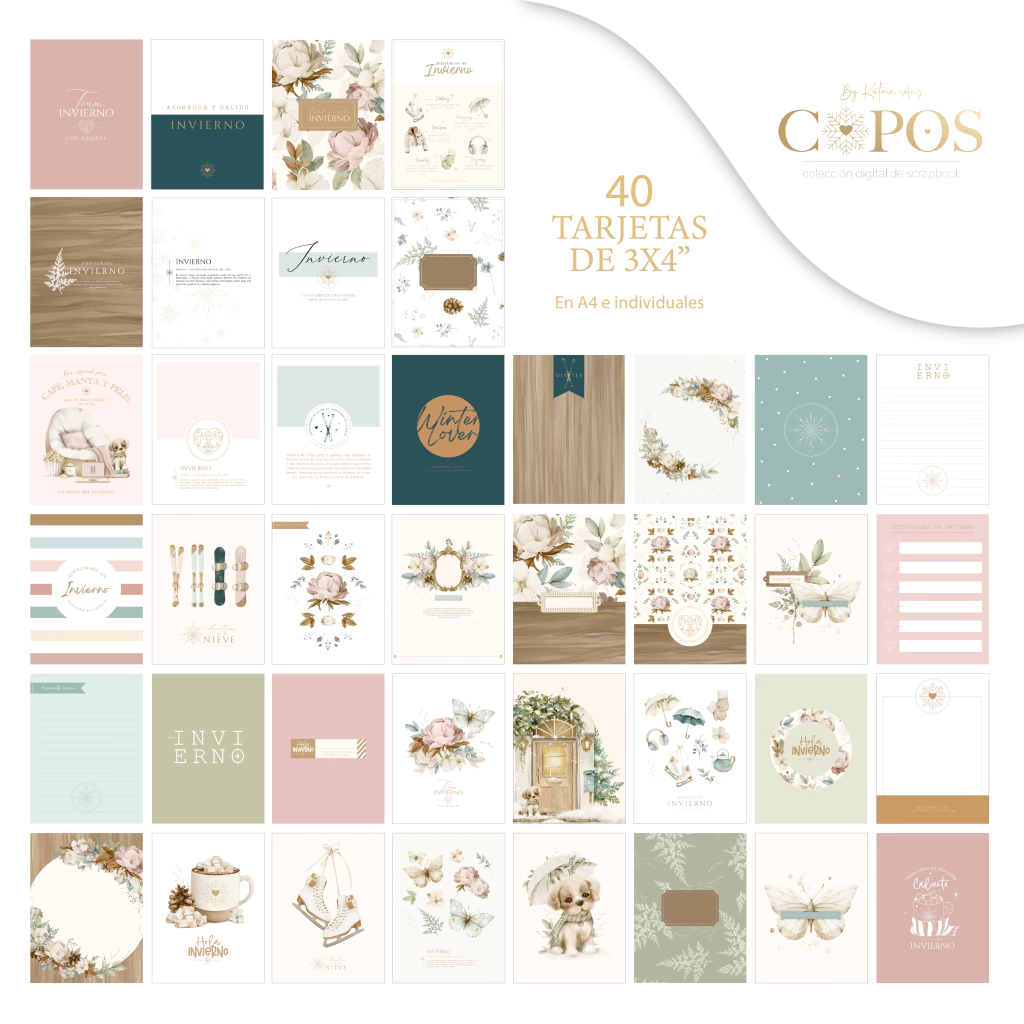 - 40 tarjetas pequeñas de project life de 3x4" y 20 tarjetas grandes de 6x4". Vienen en hojas A4 e indíviduales. En formato JPG y PDF.